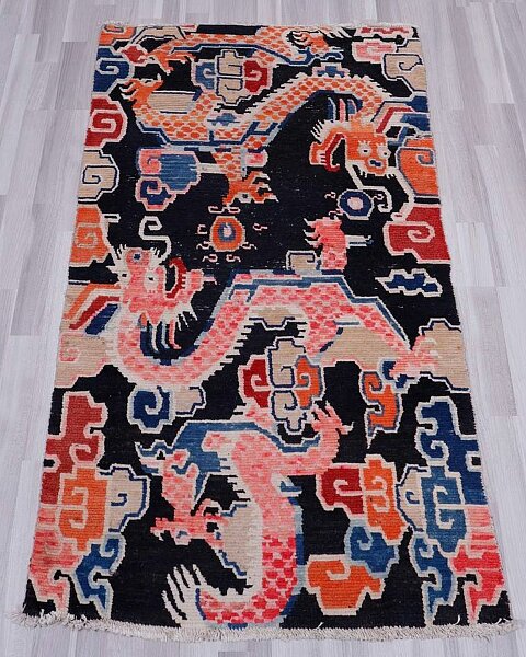 Tibet,antik mit Klassische Zeichnung, Schwarzes Zentralfeld mit großflächigem Drachendekor,ca.1900